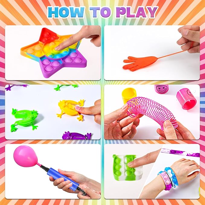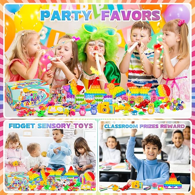 - IDEAL GIFTS IDEAS: The fidget assortment party favors toys are the first gifts choice for kids birthday party gifts, classroom treasure box prizes,carnival prizes in bulk,holiday gifts,pinata stuffers, goodie bags stuffers, birthday party favors,giveaway gifts toys,return gifts party toys,Christmas stocking stuffers,party favors for kids8-12 and etc,.Various toys bulk with bright colors, boys girls can choose their favorite toys,must become a hit on party favors.