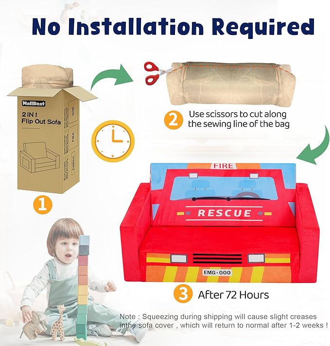 MallBest Kids Sofas, Extra Wide Toddler Couch Bed - 2 in 1 Baby Convertible Foam Chair to Lounger,Toddler Couch for Boys and Girls,Red/Fire Truck