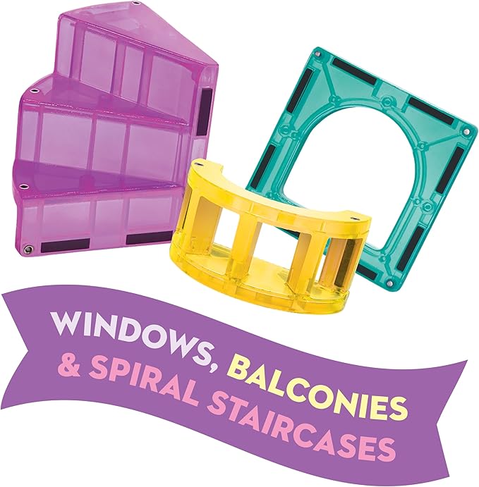 - What’s Included: 48 magnetic pieces, including 1 drawbridge, 1 Dragon Figure, 1 Royalty Figure, 2 Spiral Staircases, 2 Balconies, 4 Windows, 2 Equilateral Triangles (glitter), 2 Quarter Circles, 5 Isosceles Triangles, 20 Squares (10 Glitter, 10 Standard), 2 microMAG Equilateral Triangles, 4 microMAG Squares, and 2 microMAG Isosceles Triangles.