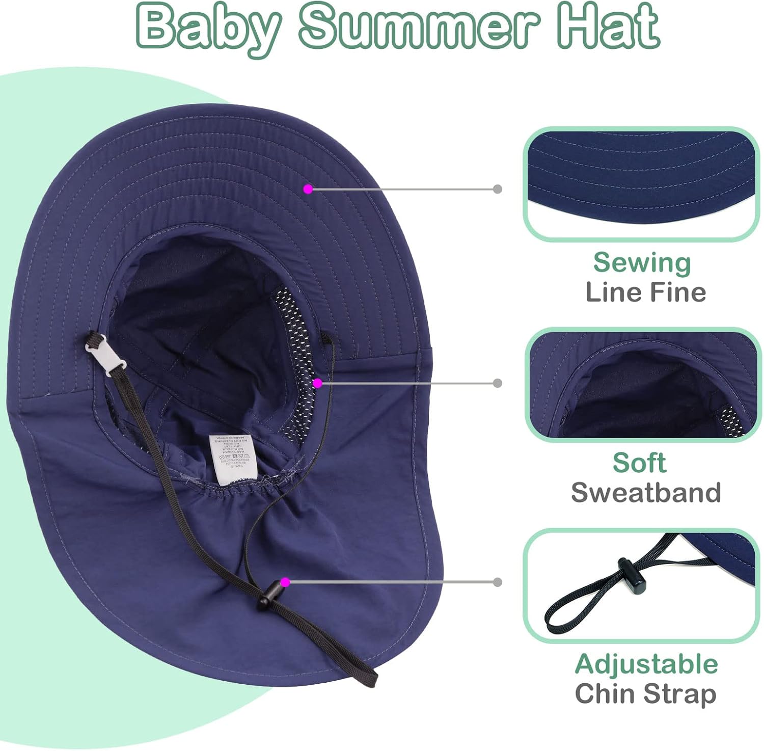 • Sun Protection: Our baby sun hat is made of 80% nylon, 20% polyester. This hat for girl can protect baby’s head, face and neck from the sun. With UPF 50+ protection, our baby boy hat with extra back coverage blocks 98% of UV Rays in summer. Wide brim help protect & shield your little angels face and eyes from the harsh UV sun rays as they play outside.