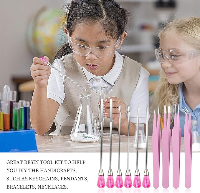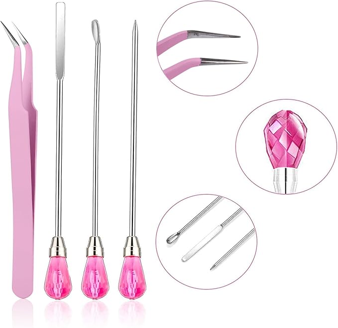 - 【11 Pcs Cute Resin Tools】: Our metal resin stir sticks includes 2 pcs stir sticks, 2 pcs resin spoons, 2 pcs poke needles, 4 pcs epoxy resin tweezers and 1 pc transfer pipette. These uv resin tools are totally enough for your daily needs and use. They will be your practical assistants in DIY resin work. NOTE:If the pink gems are loose. A simple twist and they are fine.
