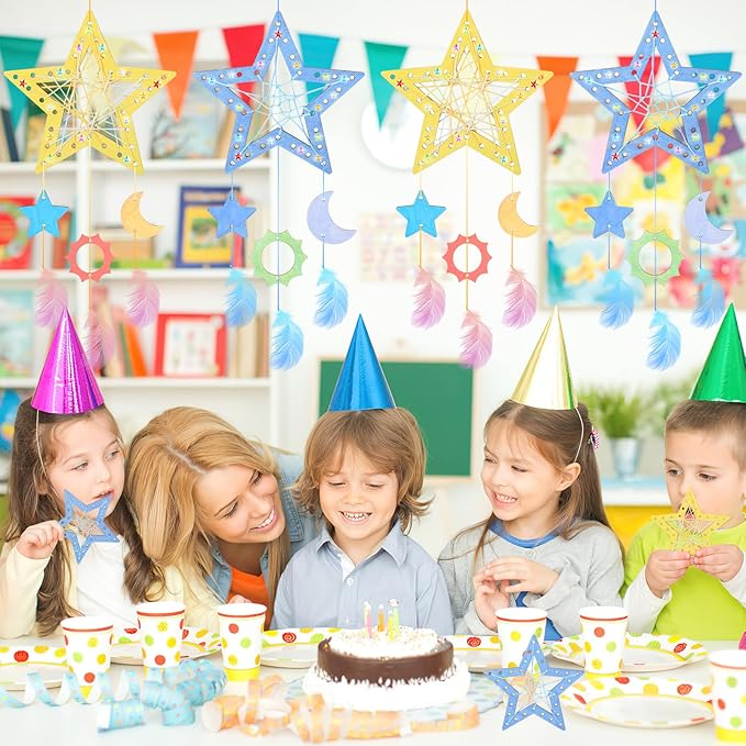 - Unfinished Wooden Star Dream Catcher Craft for Kids: contains 8Pcs large-size wooden Star cutouts, 24 small (in Star,moon, sun 3 style)wooden cutouts, 100 feathers in Macaron color, and 8 packs of colorful cotton thread, offering endless decoration possibilities for kids, Paint You Own Cute Star Dream Catcher on 4th of July