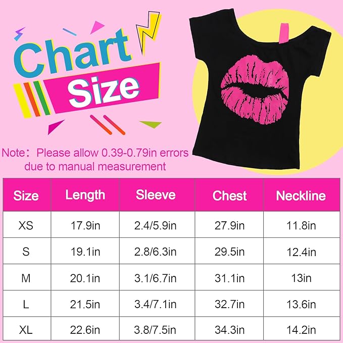 • 27pcs 80s Outfits for Girls: Women Girls 80s costume set update: extra wig with hairnet&clip included; Also contains 1 lip print neon T-shirt, 1 Rainbow colored tutu skirt, 1 hairband, 1 glasses, 1 pair of earrings, 1 pair of fishnet gloves, 1 pair of legwarmers, 4 neon beaded necklace, 10 neon beaded bracelets; Our costume comes with all the accessories you need; Our designs are inspired by the 80s and showcase the bold and vibrant style, making the 80s theme party funny and unforgettable