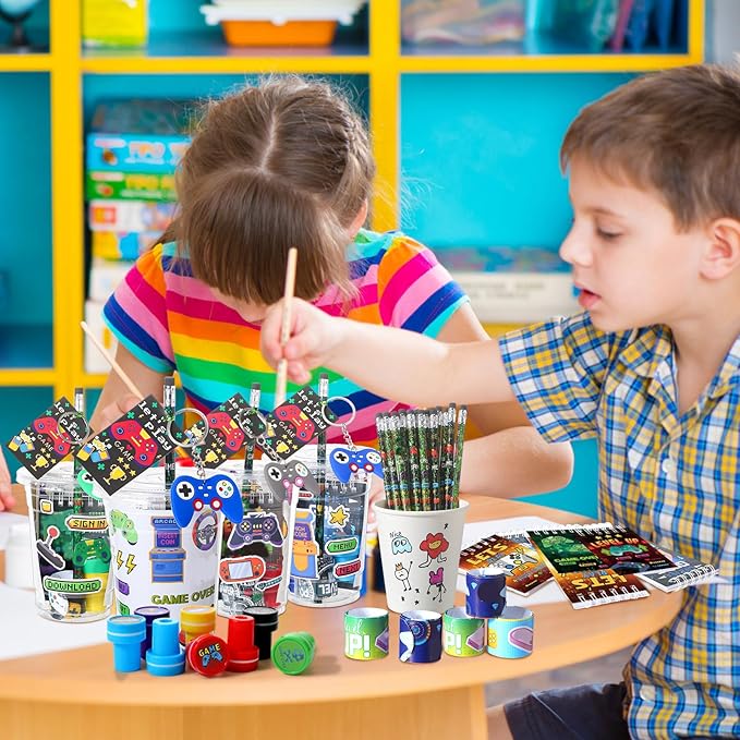 - DIY Drink Cups: unleash your inner artist with our DIY 24 oz drink cups, approximately 4.76 x 3.86 inches in size; You can decorate the cup with our stickers, fill it with bracelets, stamps and other trinkets, then close the lid, insert our pencils, hang the keychain, tie the tag tightly with a pencil, and you'll get a lovely gift cup; Mess around with the colors, stickers, and other gaming party favors to create your gaming party favor by letting your creativity run wild