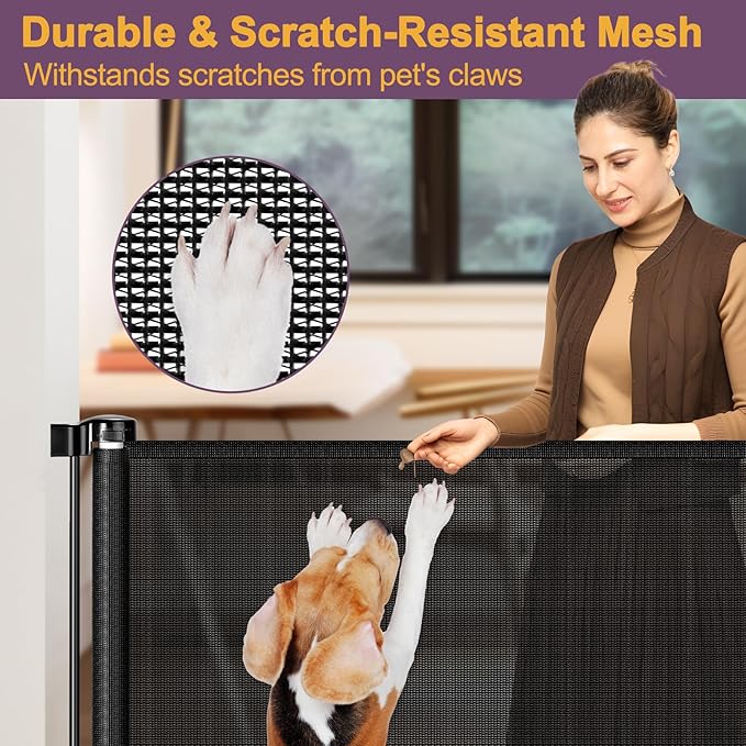 - Durable & Scratch-Resistant Mesh: Our extra tall retractable baby gate is made of upgraded mesh lining that is durable, soft and scratch resistant. It can withstand the scratching of your dog's paws.