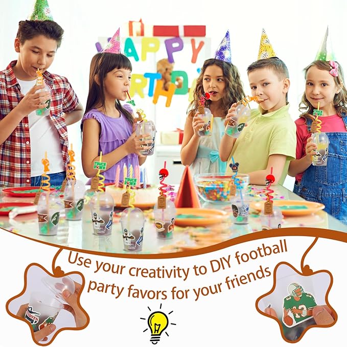- Fun to DIY Your Party Favors: you can put Football whistles, mini Football and other small items into the goody cups, close the lid, and you can decorate it with the stickers, insert the cute straw, tie the thank you tag to the straw with twist ties, decorate a novelty cup for your friend, which will bring more joy to your party.