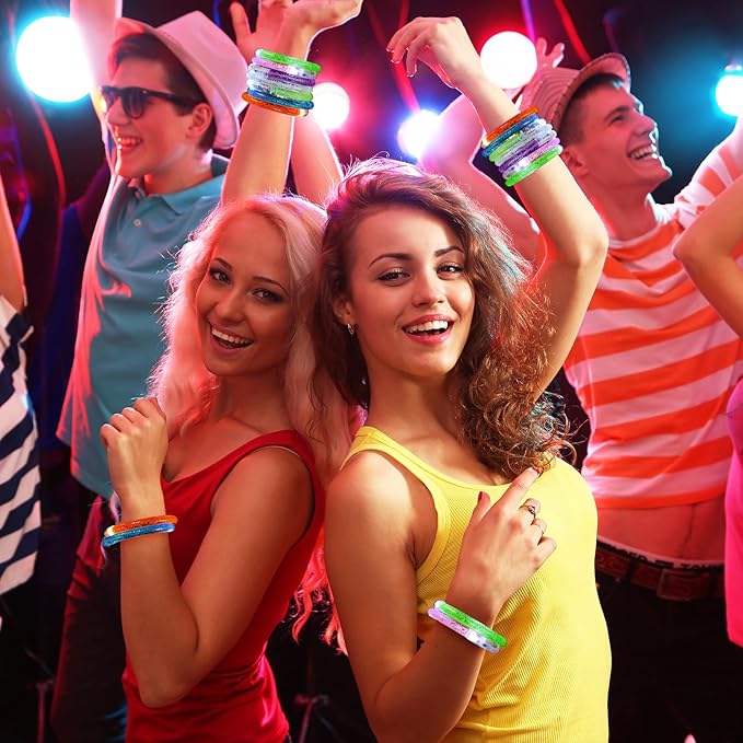 - Colourful LED Bracelets Set: The package includes 50 packs of LED light up bracelets, available in 7 different colors: pink, blue, purple, yellow, green, orange and transparent. Rich quantity and colors to meet your needs, bringing different visual enjoyment.