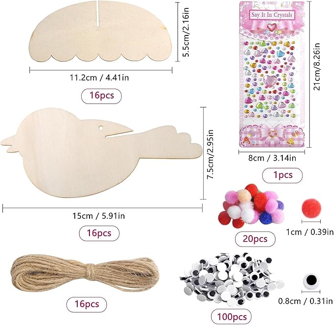 - 【Wooden Birds for Crafts】Includes 16 unfinished wooden birds, 5 pieces of 1 meter silver wire, 100 eyes, 20 colorful pom poms, 1 heart sticker, 2 painting brushes, 12 different colors of acrylic paints; Our wooden birds for crafts are perfect for kids painting and DIY, make it look more vivid and fashionable.