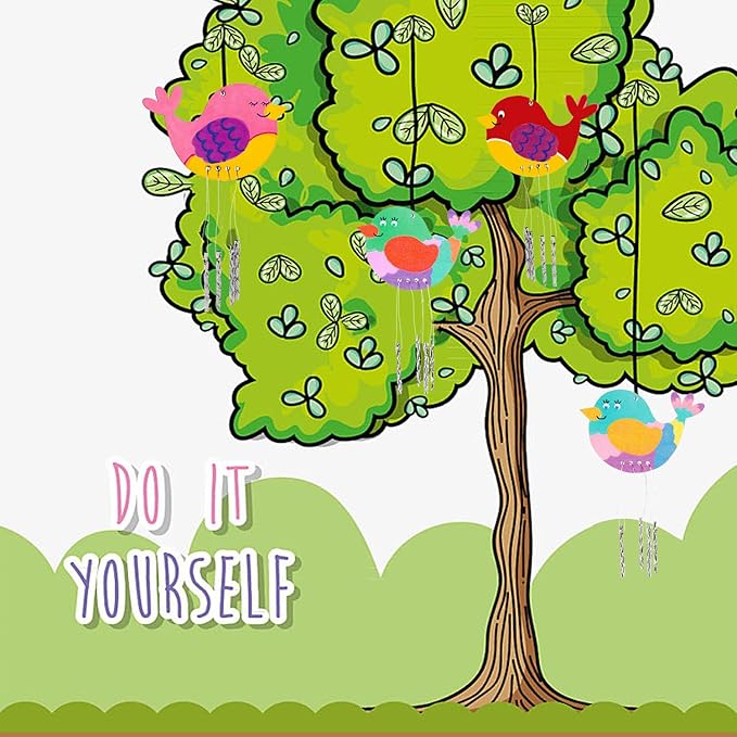 4pcs DIY Wooden Bird Wind Chime Crafts for Kids with Paint Kit Rhinestone Flower Stickers Summer Arts and Crafts for Kids 3 and Up