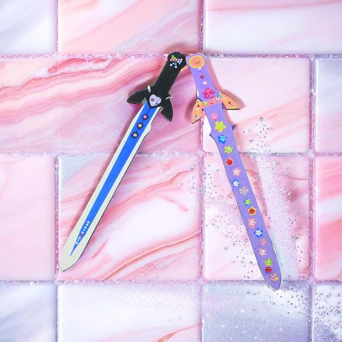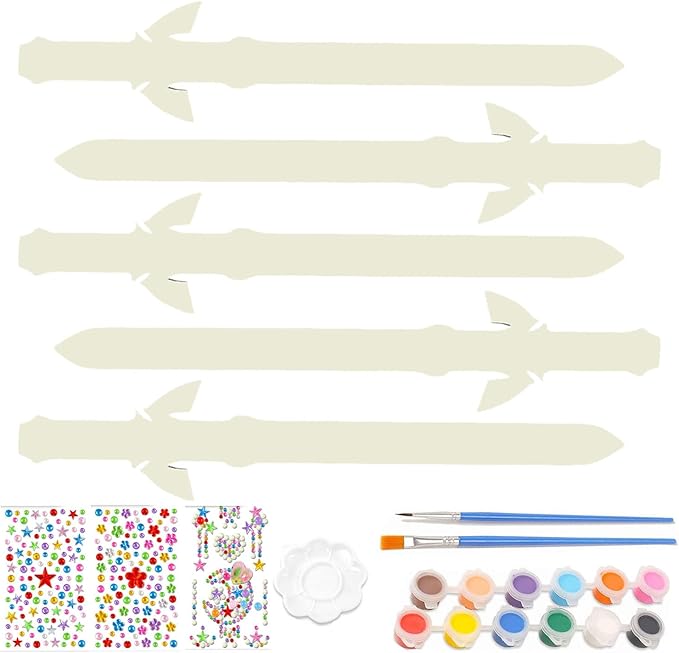 - The words forkids includes 5 blank wooden chip swords, 12 different colored pigments for painting, 1 color palette, 3 different colored diamond stickers, and a part of the hemp rope that can be tied to the handle of the wooden chip sword. The diverse materials provide greater imagination space for creating creative and unique designs