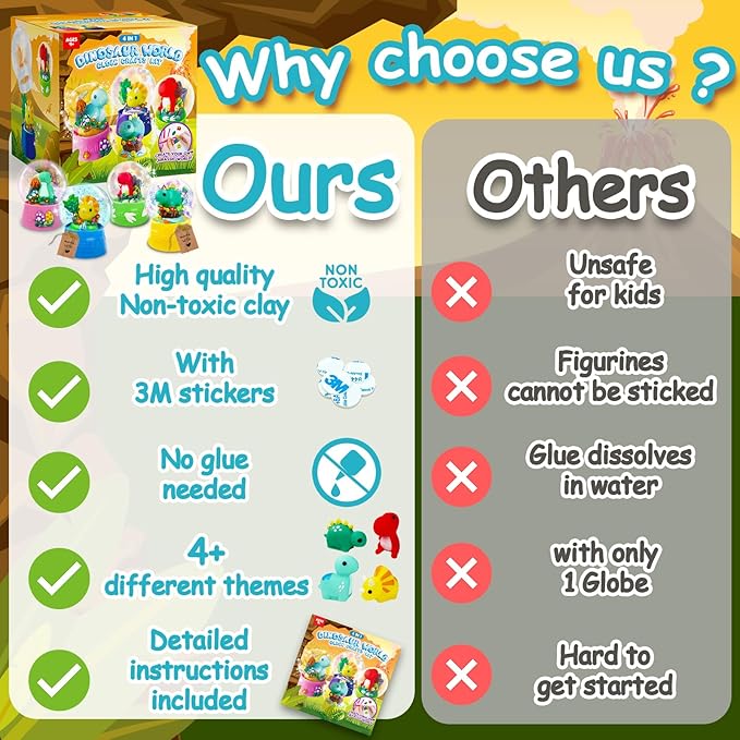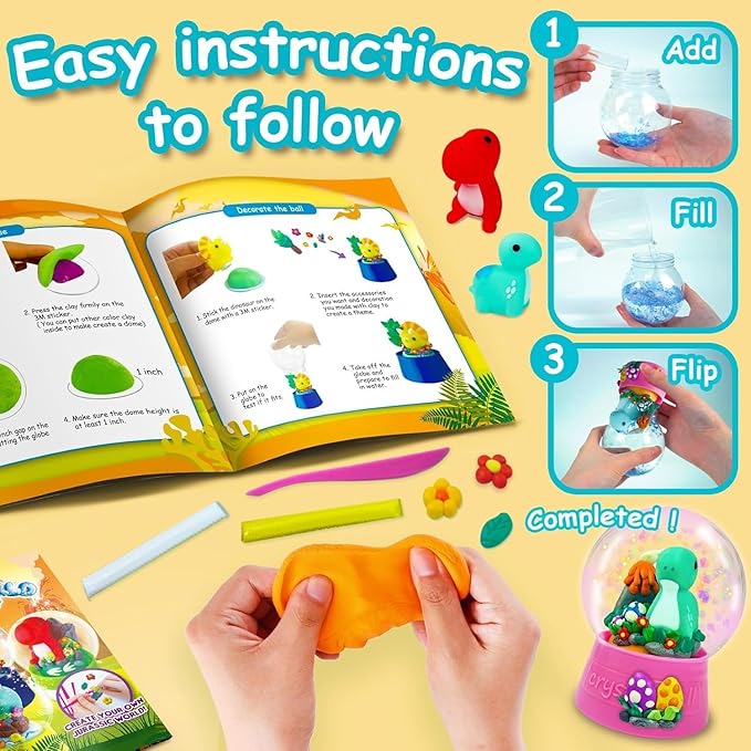 - 🦴ALL-INCLUSIVE | This craft kit for kids boasts four water globes, figurines, clay, glitter, sequin, stickers, clay tools, tags, and clear instructions. Whether it's snow globes for boys or activities for kids, it's an engaging craft kit for kids, providing endless hours of fun and creativity.