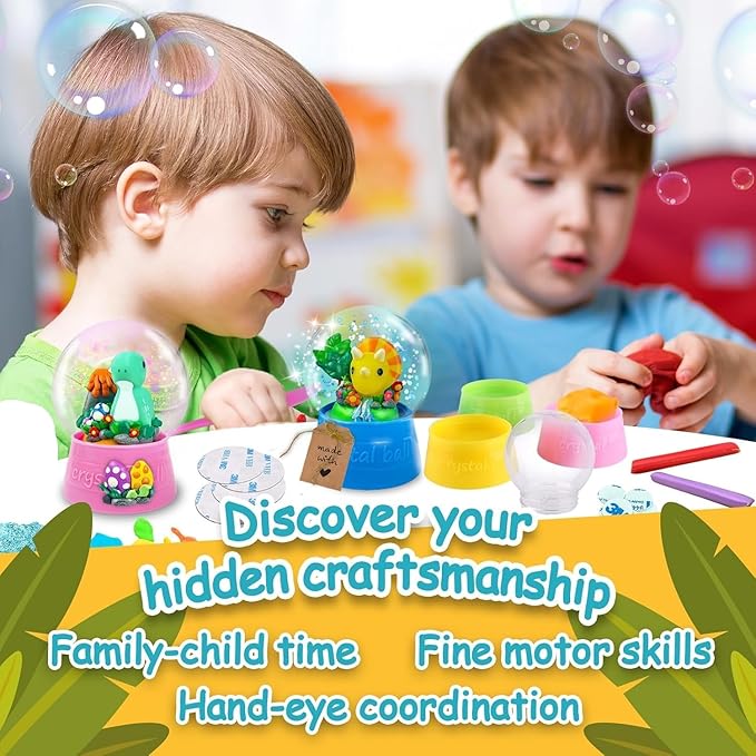 - 🦴ALL-INCLUSIVE | This craft kit for kids boasts four water globes, figurines, clay, glitter, sequin, stickers, clay tools, tags, and clear instructions. Whether it's snow globes for boys or activities for kids, it's an engaging craft kit for kids, providing endless hours of fun and creativity.