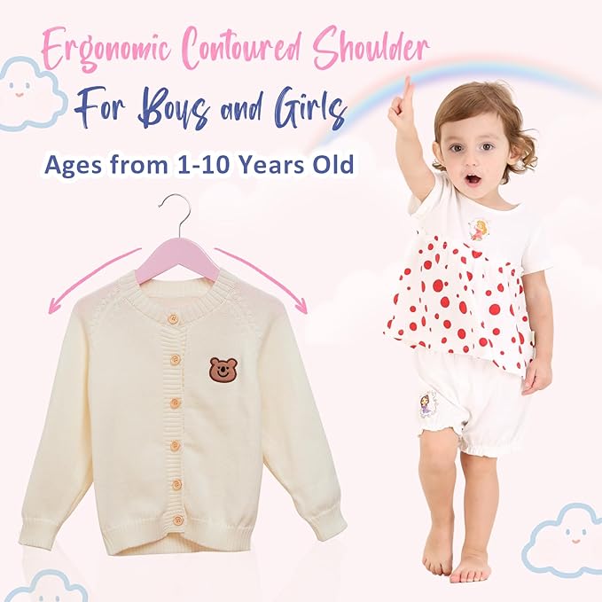 - Child-friendly Design & Gentle on Clothes: Well-polishing childrens hangers with smooth finish will protect little hands. No rough edge and burr on the child hangers' surface to avoid scraping delicate clothes.