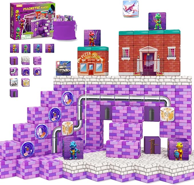• ● Magnetic Blocks - Dinosaur Adventure Games: Dive into a magnetic action-packed world with our unique magnetic blocks set! The magnetic blocks features four brave dinosaur heroes and vivid city buildings. Kids will get magnetic toys to build their vibrant magnetic blocks cityscape like lively restaurant house and cozy rest area. Unleash your kids' creativity and enjoy hours of role-play fun with these magnetic cubes!