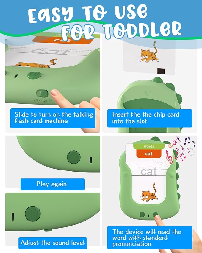 - Interactive Learning: This dinosaur-shaped talking flash card reader comes with 168 double-sided 336 words cards covering over 20 themes such as colors, animals, and fruits. It supports multiple learning modes including listening, speaking, reading, writing, and drawing. This device not only boosts fundamental cognitive skills but also enhances memory through engaging interactions, making it a great tool for comprehensive child development