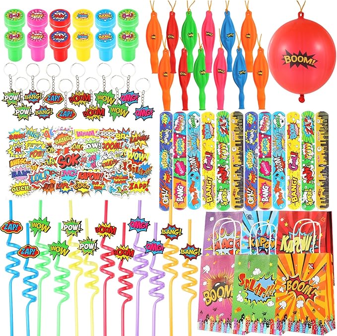 LiYiQ 122 Pcs Hero Party Favors with Hero Punch Balloons Reusable Drinking Straws Hero Slap Bracelets Keychains Stamps Stickers and Gift Bags for Kids Hero Birthday Party Supplies (Style 1)