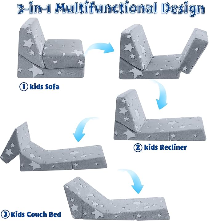 - [3-in-1 Toddler Lounge Chair] The kids' sofa chair features a flip out and inclined back, and converts to a floor couch bed, the child can sit, half recline, or lie down comfortably