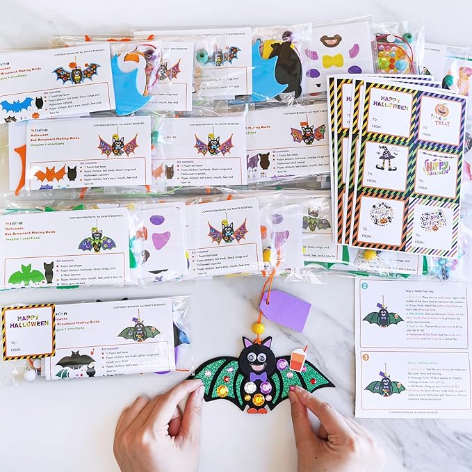 - 24 Sets Halloween Craft Kits Fall Kids Craft Kits: This holiday set includes 24 individually wrapped kits with 6 unique bat designs, perfect for Halloween classrooms and parties. Each design has 4 kits for a complete craft experience. Included in each kit are 1 bat shaped foam base, foam stickers for bat body, fancy wings and Halloween treats, paper stickers for bat's ears, mouth, feet and bow tie, 2 google eyes stickers, 1 jewel stickers sheet, 1 cord, 1 wooden bead, and 1 gift tag and 1 guide.