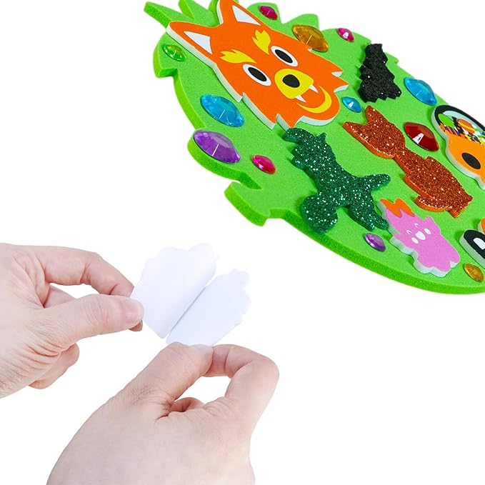 - Material: Pre-cut foam shapes and Halloween foam stickers are made from thick EVA foam. The foam stickers have adhesive backing for easy application. Pumpkin face stickers are printed on sticker paper, and the googly eyes stickers are made from plastic with adhesive backing. The string cords are polyester, and the cellophane bags are plastic. No glue and mess, these Halloween foam crafts are easy and fun to make. Once completed, they can be hung on the tree, window, wall, or doorknob.