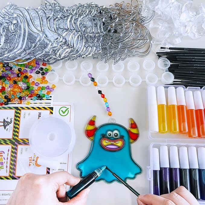- Quantity: DIY Halloween Suncatcher Paint Kits include 30 Halloween suncatchers in 10 designs, each design has 3 pcs. 20 bottles of 11 Halloween colors suncatcher paints (6ml per bottle), 1 strip of 8 empty paint pots, 30 paintbrushes, 360 Halloween acrylic beads, 1 roll of fishing thread, 30 suction hooks, and 30 Halloween gift stickers. Each Halloween window suncatcher has a hole at the top for hanging. Perfect for Halloween parties, family fun, classroom activities.