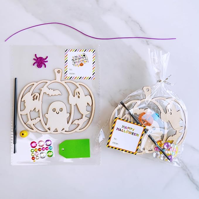 • Complete Craft Kit: Dive into the Halloween season with Halloween craft kit, perfect for creating 24 wooden pumpkin ornaments. This pumpkin crafts set includes 24 unfinished wooden pumpkin shapes, 2 set of acrylic paints, 24 paintbrushes, 1 palette, 7 glitters, 24 Halloween-themed glitter foam stickers, 24 gem stickers, 24 cords, 24 wooden beads, 24 treat bags, 24 twist ties, and 24 gift tags. Ideal for family crafting, school projects, and Halloween party decorations.