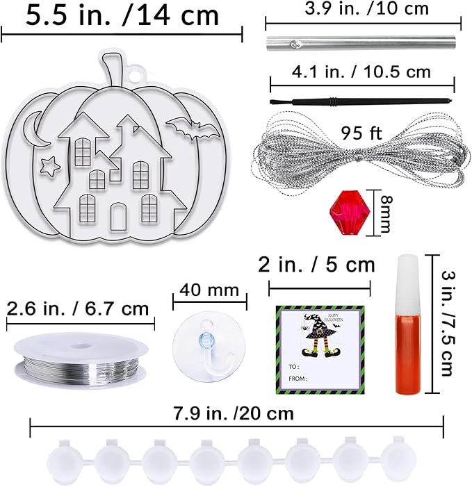 - Size: Pumpkin sun catchers are about 5.5" in diameter. Each bottle of suncatcher paint is 0.2 fl oz/6ml in capacity. Each mini empty paint pot holds 0.06 fl oz /2ml of paint. Acrylic beads are about 0.3" in diameter. Each metal wind chime tube is about 3.9" L. The silver thread is about 95 ft long. The fishing thread is 590" L. Each suction hook is about 2.4" in diameter. The finished Halloween pumpkin suncatcher wind chime ornaments are perfect for hanging in the window, glass door, or porch.