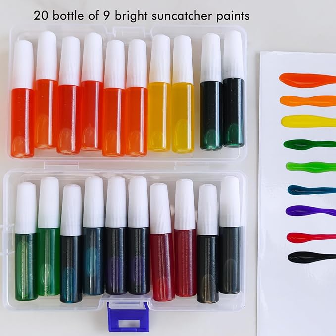 - Quantity: 24 sets Halloween Pumpkin Suncatcher Wind Chime Kits include 24 Halloween pumpkin suncatchers in 8 designs. 20 bottles of 9 Halloween color suncatcher paints (6ml per bottle), 1 strip of 8 empty paint pots, 24 paintbrushes, 288 acrylic beads, 72 wind chime tubes, 1 roll of silver metallic thread for hanging wind chimes, 1 roll of fishing thread, 24 suction hooks and 24 gift stickers. Each suncatcher has a hole at the top for hanging and 3 holes at the bottom for attaching wind chimes.