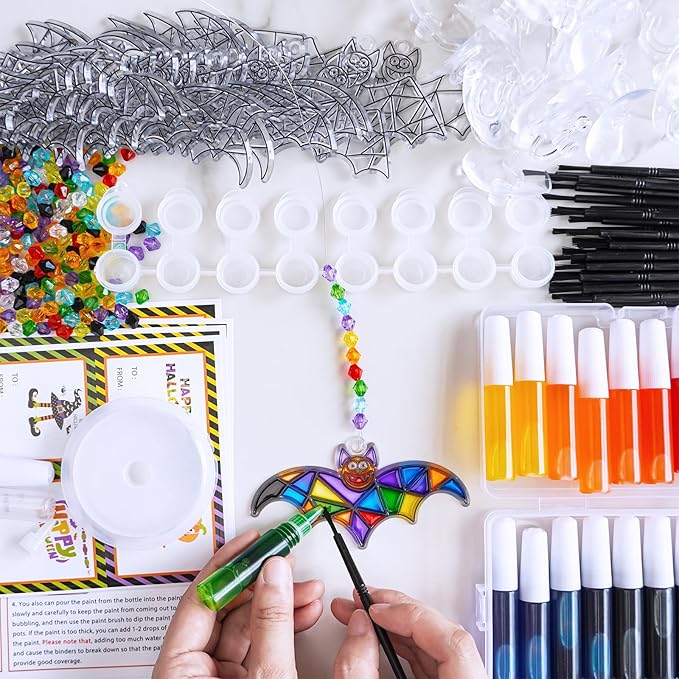 - Enhance kids' Halloween decorations with our 27 Halloween Bat Suncatchers Craft Kit: This Halloween craft kit includes 27 Halloween bat suncatchers in 9 designs (3 pieces per design), 20 bottles of 7 Halloween paint (6ml each), 1 strip of 8 empty paint pots, 27 paintbrushes, 324 Halloween beads, 1 roll of fishing thread, 27 hooks, 27 gift stickers. This Halloween bat suncatchers paint kit is perfect for kids' Halloween crafts, fall activities, and holiday decorations.