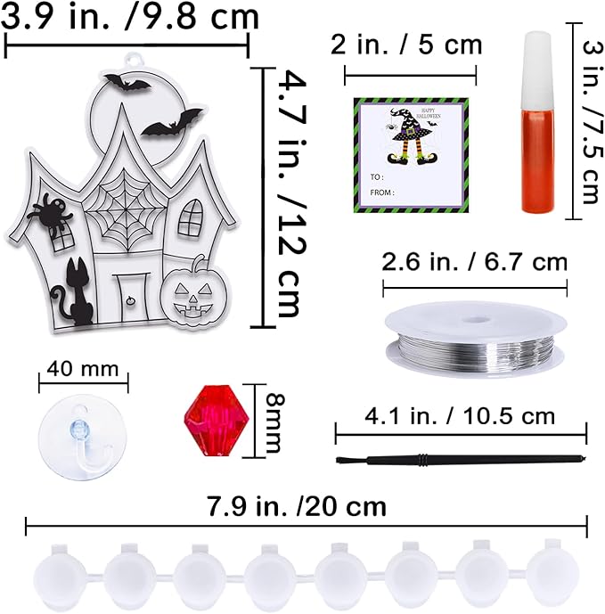 - Size: These transparent Halloween window art suncatchers are about 4" in diameter. Each bottle of suncatcher paint holds 0.2 fl oz (6ml), and each mini empty paint pot holds 0.06 fl oz (2ml). The acrylic beads measure about 0.3" in diameter, and the fishing thread is 16 yards. Each suction hook is about 2.4" in diameter. Once completed, the Halloween window hanging suncatcher ornaments are perfect for glass windows, doors, porches, or gardens, casting a warm and festive glow as they capture the sun's rays.