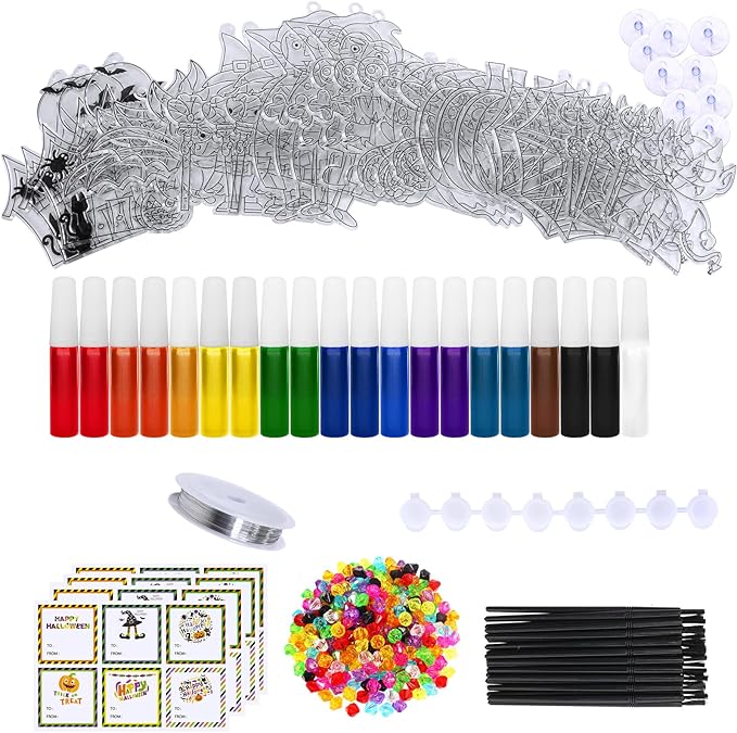 - Quantity: Halloween Suncatcher Paint Kits include 27 Halloween suncatchers in 9 designs, each design has 3 pcs. 20 bottles of 12 Halloween colors suncatcher paints (6ml per bottle), 1 strip of 8 empty paint pots, 27 paintbrushes, 324 Halloween acrylic beads, 1 roll of fishing thread, 27 suction hooks, and 27 Halloween gift stickers. Each Halloween window suncatcher has a hole at the top for hanging. Perfect for Halloween parties, family fun, classroom activities.