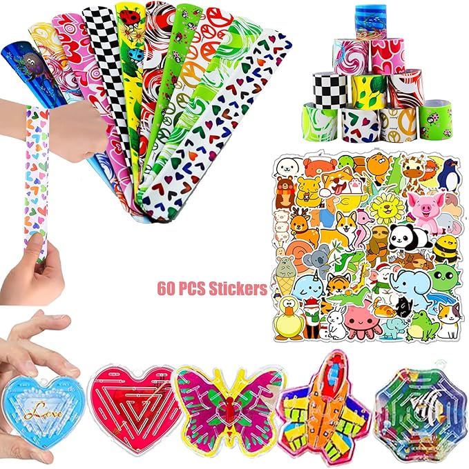 - 【124 Pack Party Favors Assortment Toys Set】Including 4 random pop fidget toys, 4 random shape mini pop keychains, 4 pop bracelets,10 slap bracelets, 6 mini tumbler toys, 60 stickers, 6 finger spinners, 6 mochi squishy toys, 6 sticky hands, 4 finger skateboards, 4 maze puzzles, 6 pull back planes, 4 animal pull back cars, Total 124 pcs 13 kinds of random color fidgets party favor toys set.