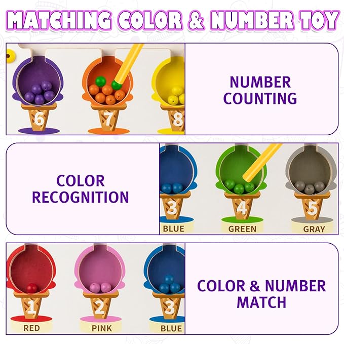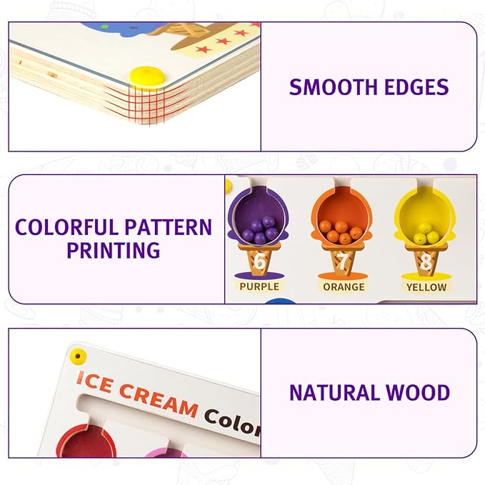 - 【Explore Colors and Counting】With its brightly colors, this toy can captivate the attention of children. Kids will have a blast as they move the beads of different colors to match the corresponding ice cream cones, fostering their cognitive development and helps kids learn colors, teaches them counting and number recognition.