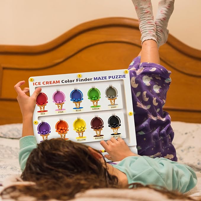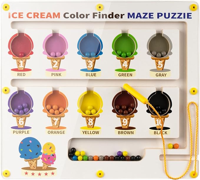 - 【Special Design】 Magnetic color & number maze includes 55 small magnetic beads and 10 different colored ice cream, due to magnetism, the magnetic pen is easy to stick to several beads at one time. Our special beads design make it not easy to stick together when moving the beads. The magnetic pen is fixed on the board, convenient storage and not easy to lose.