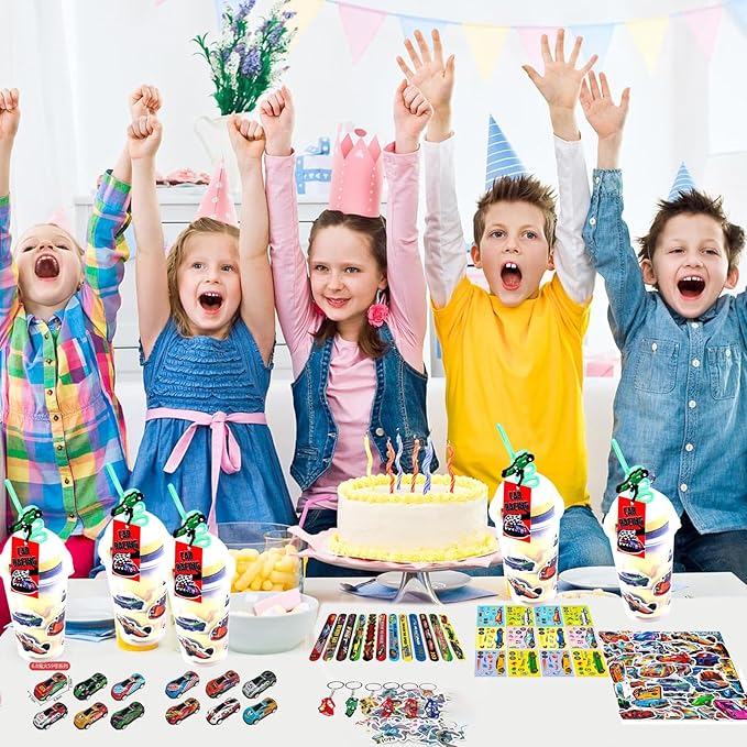 - 1. Race Car Goodie Bags : With our cars party favors, you can make your party full of high-speed fun! You will receive 12 cups, 12 straws, 12 racket bracelets, 12 mini racing car, 12 DIY stickers, 6 racing keychains, 12 small cards, and 50 racing themed stickers. This set will make your party full of joy and make children even happier