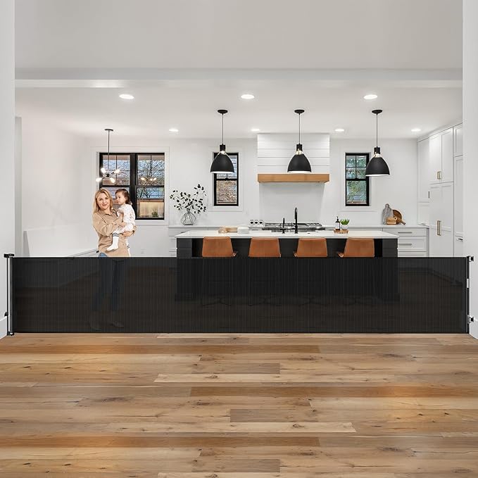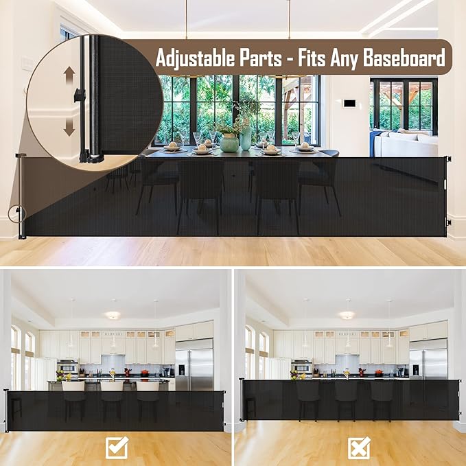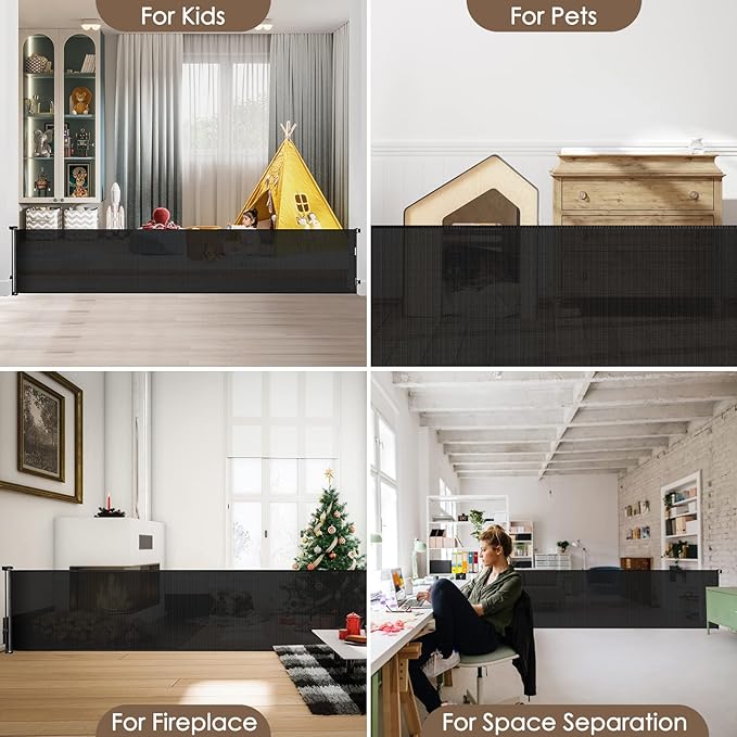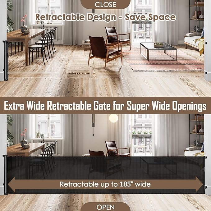 - 185-inch Extra-Wide Coverage: This retractable baby gate extends up to 185 inches, making it perfect for securing large indoor and outdoor openings. Whether it's doorways, hallways, garages, decks, or more, this baby fence gate works effectively as both a barrier and room divider.