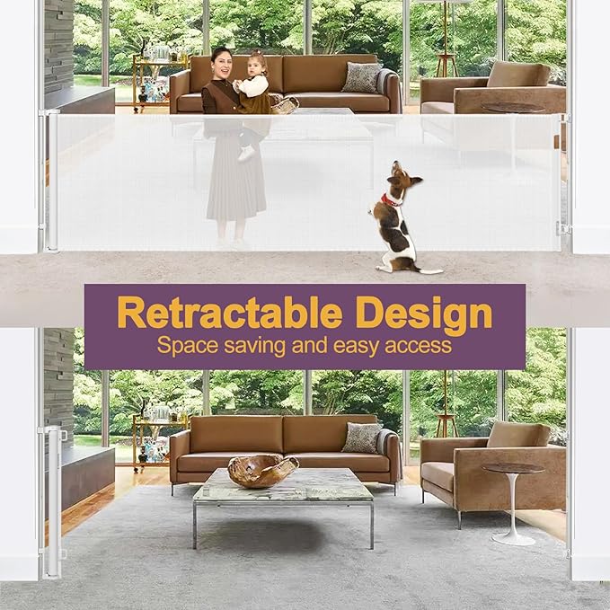 - Suitable for Indoor and Outdoor Wide Openings: Our extra tall and wide retractable baby gate is suitable for indoor open kitchens, bottom of stairs, doorways, hallways and outdoor decks, patios, garages and more.