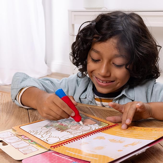 - Chunky-sized water pen is easy to fill, easy to hold, and stores in the compact, spiral-bound book, a great mess-free travel activity