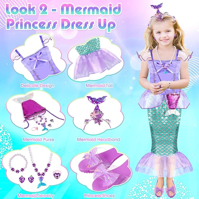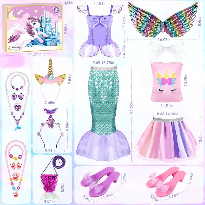 - Unicorn & Mermaid Kids Dress Up Clothes for Play --- Rainbow unicorn princess dress up costume set & purple mermaid costume set for girls 3-6. Includes tops, skirts, headbands, princess dress up high heels, necklaces, earings, bracelets, rings, unicorn wing, mermaid purse. Every item is carefully matched. No need to buy other dress up accessories to fit our play dress up clothes set for toddler girls. Super value kids dress up & pretend play toys for little girls toddlers age 3 4 5 6