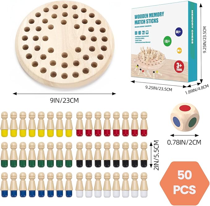 - KIDS EDUCATIONAL STEM TOYS: Fine wooden memory game with solid wooden board, dice and 48 wooden peg pieces in six different colours (8 pieces in each colour). For children over 3 years old, help to improve children's awareness of color, logical ability, and curiosity. Kids can have fun with their friends by using this chess game set, parents can use it to play parent-child games to bring them closer together