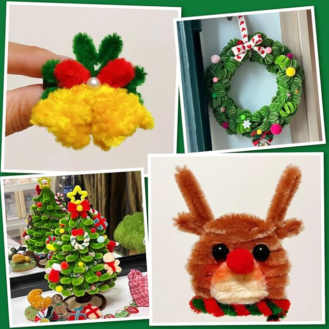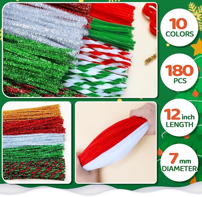 180pcs Christmas Pipe Cleaners, Pipe Cleaners for Crafts, Craft Supplies Multicolor Chenille Stems for Art&Craft Christmas DIY Projects(10colors,Christmas)