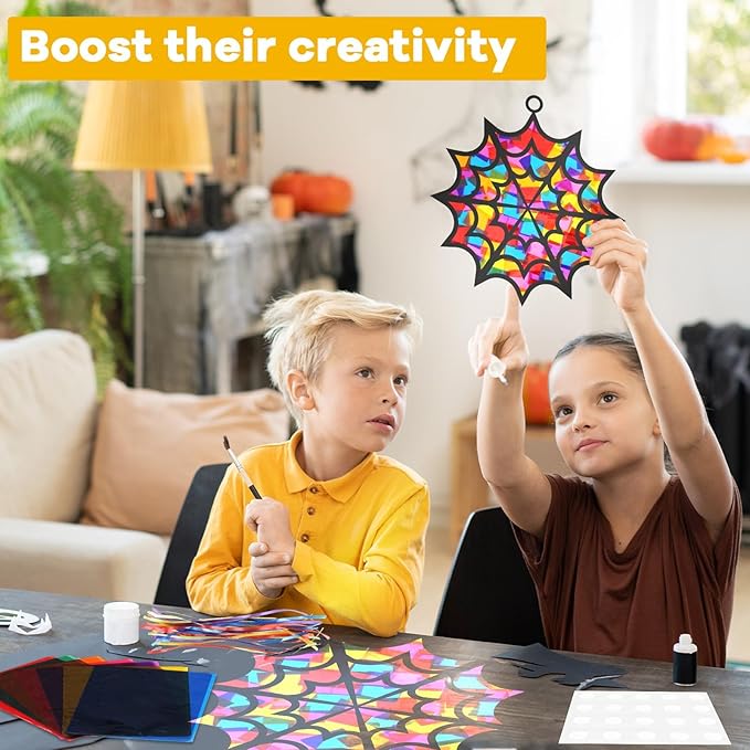 - Great gift for kids: This Halloween craft kits for kids is an excellent gift choice for children who love arts and crafts. This easy and simple Halloween DIY suncatcher paper craft contains all the materials you need to design and make Halloween spider web suncatchers, allowing kids to unleash their artistic side and create beautiful decorations that bring a burst of color and light to any space.