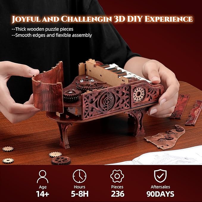 - 【Intricate Gear Mechanics】Inside this 3D wooden puzzle piano, a multi-stage gear system comes to life as you play, visible through a transparent cover.