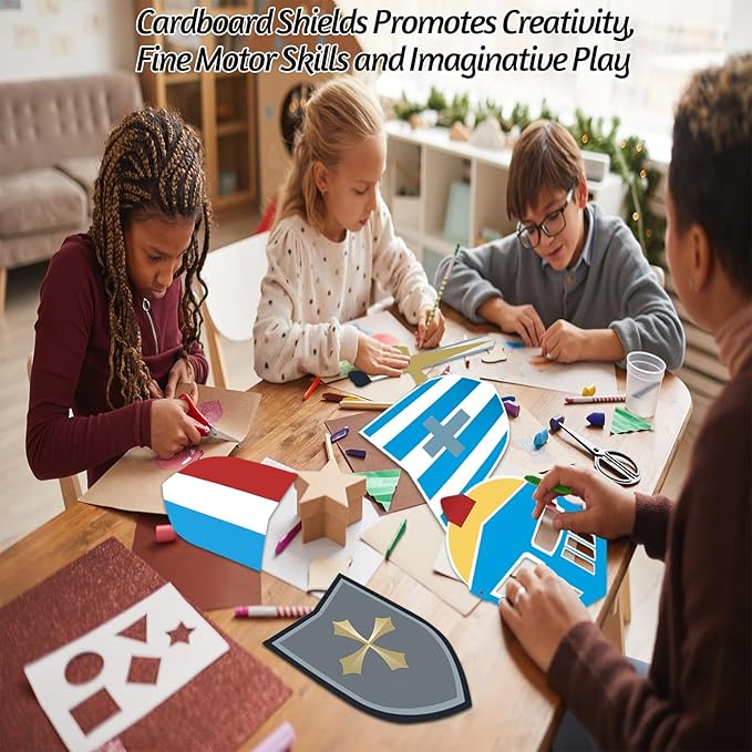 - Sufficient quantity: You will receive 10 sets DIY knight play set, including 10 knight cardboard shields, 10 knight masks, 10 knight swords, 10 knight knife, our DIY knight play set is the perfect way to spark your child's imagination and creativity. this set includes everything your little knight needs to create their very own cardboard shields and swords for endless hours of play.
