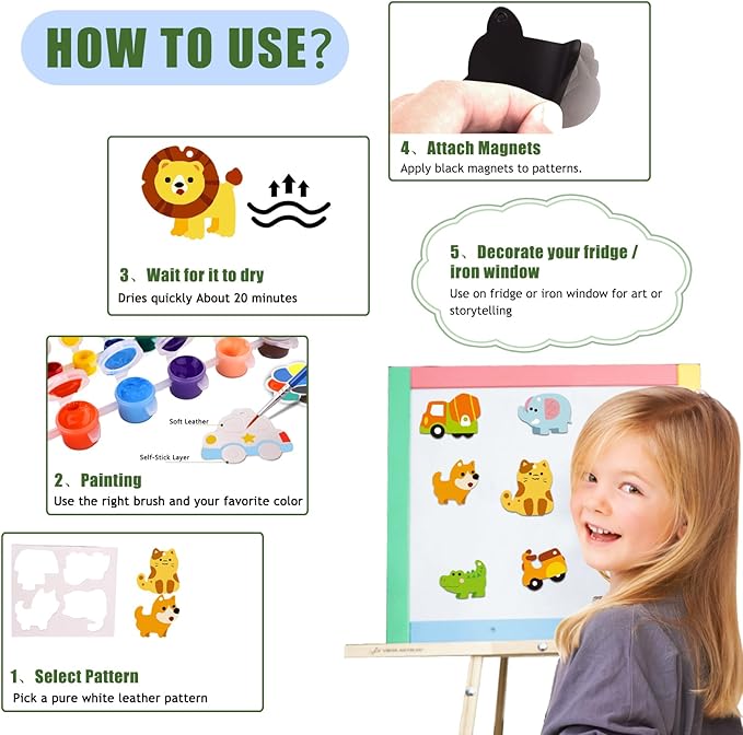 - DIY Magnetic Painting Kits for Kids Ages 4-8: Includes soft leather pendants in 6 Animal and 6 Vehicle shapes. These kids painting set magnets are safe and fun for kids