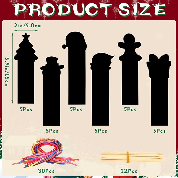 - Package Content:Package contents 30 pieces Christmas bookmark craft kit, including 30 beautiful bookmark crafts for kids (size 15 x 5 cm/6 x 2 inch), 30 colored ropes and 12 bamboo sticks, These Christmas scratch cards are suitable for children to DIY with friends at Christmas parties