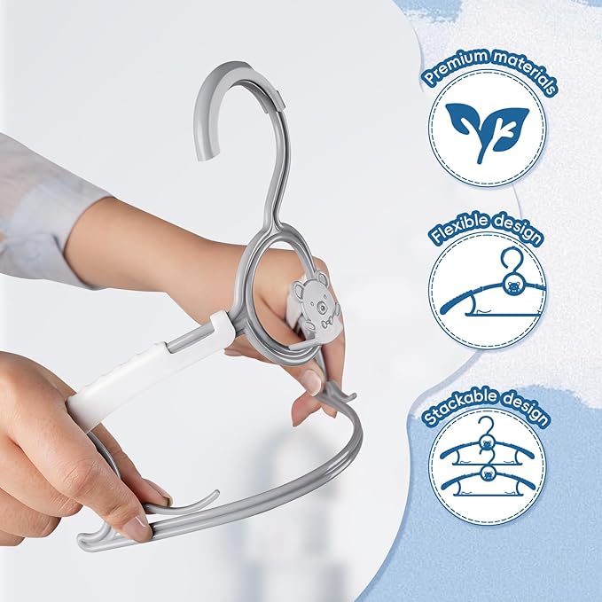 - Stackable Design :Maximize your closet's vertical space with our stackable baby clothes hangers. Stackable for vertical arrangement of kids' outfits, toddler hangers empower you to become your child's personal stylist, simplifying wardrobe coordination