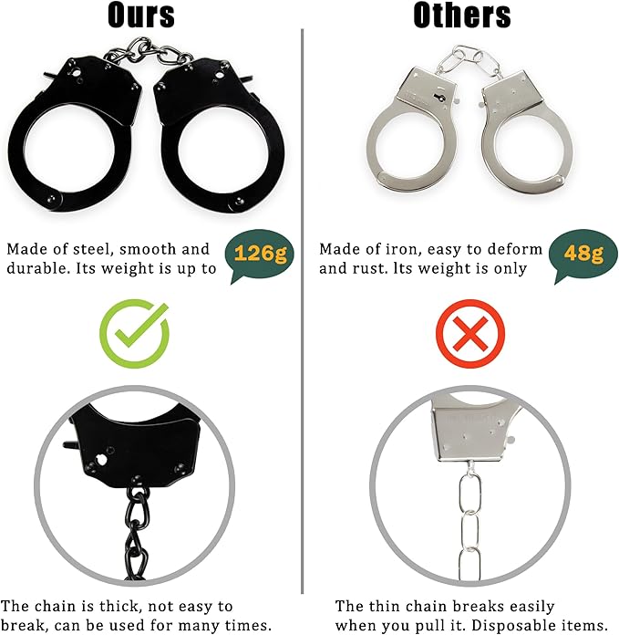 - Metal Construction: Made from robust metal, these handcuffs are designed for longevity and consistent use. They’re perfect for repeated use in various scenarios, ensuring lasting value