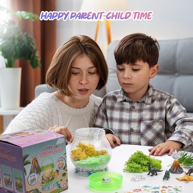 - Hycekon Light Up Terrarium Kit with Dinosaur Theme is a Miniature Landscape of Nature. Craft kit for gilrs includes carry jar, shiny crystals, moss, sand, dinosaur, volcano and so on. Although all plants and mosses are fake and have no growth process, they are still a good way for your child to discover the beauty of nature and the magic of dinosaur by creating their own beautiful dinosaur terrarium with the craft kit.