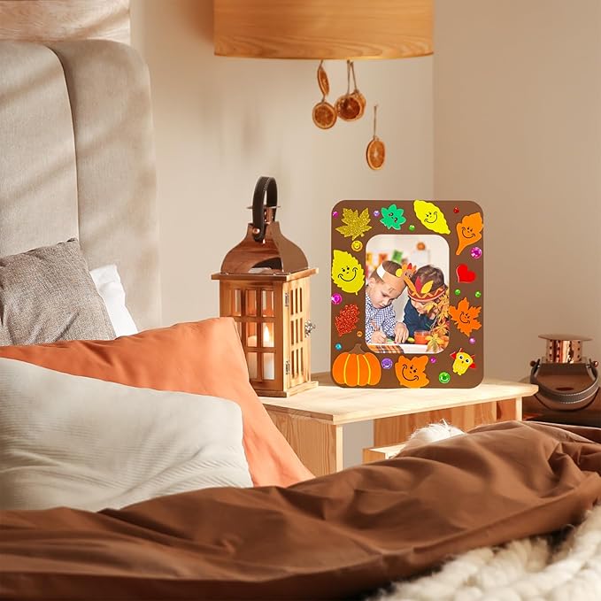 - Perfect for Little Hands: Each autumn harvest frame measures 6.3" x 7.9", with a photo cutout of 5" x 3.5", designed to fit comfortably in little hands. This kits include assorted autumn harvest-themed foam stickers, smile fall leaf stickers, and glittery leaf stickers, all sized between 1" and 2" for kids. Simple instructions encourage children to choose their favorite photos, secure them in the frame, and decorate with fun festive stickers, then easily attach the stand for display or gifting.