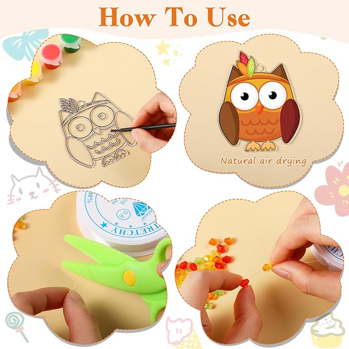 - Quality Material: our DIY suncatcher craft kit are made of quality acrylic material, lightweight but not easy to break; The suncatcher paint dries translucent and allows sunlight to pass through; The colorful beads are made of plastic with a tiny hole in the middle so you can string them together with the fish thread; Children can have fun choosing which design they want to paint and then use the included paints to bring their suncatcher to life
